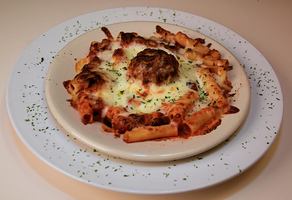 Imported ziti cut pasta topped with a meatball and Mrs.